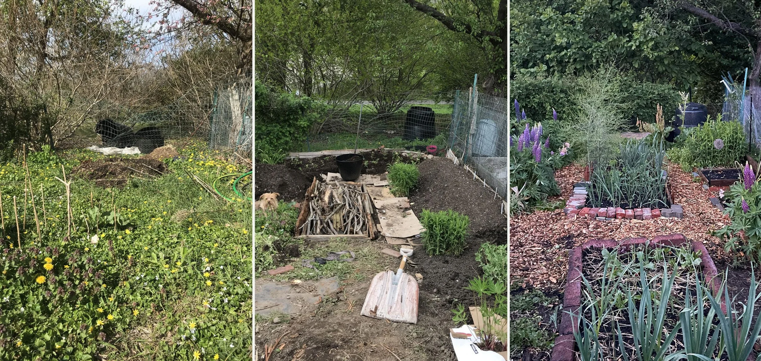 Four-year transformation of an overgrown 30'x15' community garden plot into productive growing space using salvaged materials and permaculture techniques. Starting with a site overtaken by lesser celandine, manual removal and sheet mulching suppressed invasives without herbicides. Raised beds built using hugelkultur methods (layered sticks topped with on-site compost) established fertile growing areas.