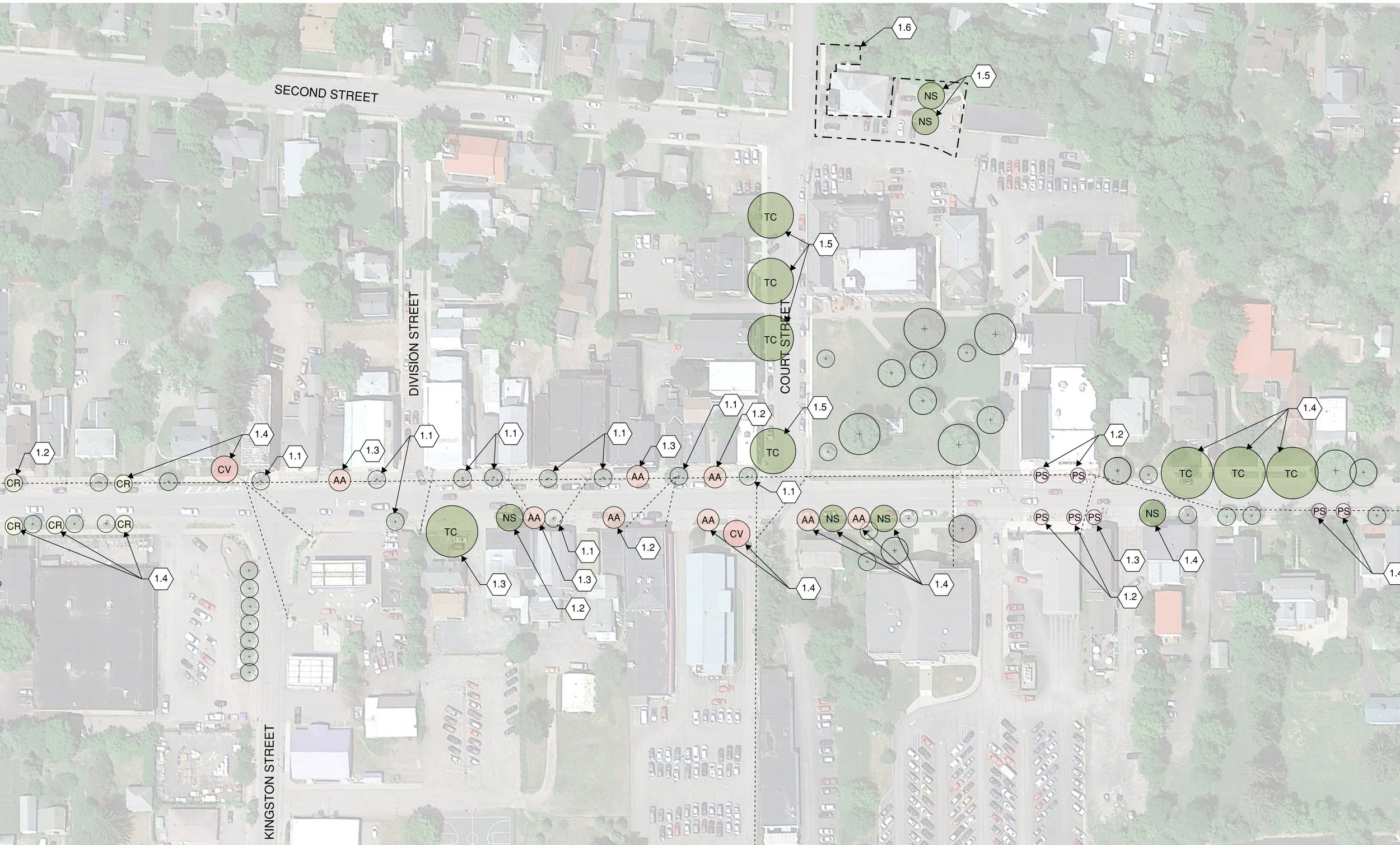 Comprehensive street tree masterplan for Delhi's downtown, developed in collaboration with garden designer Don Statham as part of the Village's NYS DRI grant submission. The plan addresses the decline of existing monoculture plantings (primarily Amur Maples) with diverse, resilient species selected for seasonal interest, appropriate scale, and climate adaptation.